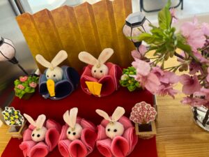 デイケアでは季節の飾り作りをしていますが雛祭りの日には、外来処置室の前に手作り雛と河津桜を飾らせて頂きました🌸どちらもメンバーさんからの提供です✨とても素敵ですよね。