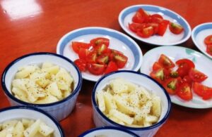 ミニトマトは切っただけ、なすとじゃがいもはレンジで簡単に調理したのみですが、患者様達からは美味しいと好評でした!