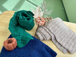 マフラーやひざ掛け・バッグなど教本をみながら編んでいます。最近ではリリアンや刺し子へ興味を示す方も増えてきました。どれも個人作業とはなりますが、同じ作業を通じて患者さん同士で、作品を褒め合ったりと、やりがいを感じやすい作業のひとつです。