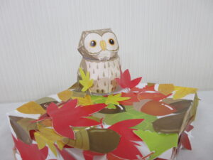 クラフト作業のプログラムでは、病棟にて患者様に作成して頂いたペーパクラフトの動物にイチョウ、もみじ、どんぐりなどで飾りつけをして頂きました!秋らしい飾りつけを相談しながら鮮やかな作品を作って頂きました!