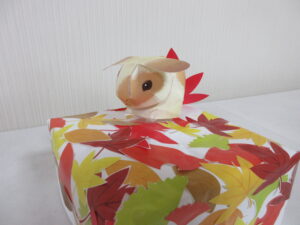 クラフト作業のプログラムでは、病棟にて患者様に作成して頂いたペーパクラフトの動物にイチョウ、もみじ、どんぐりなどで飾りつけをして頂きました!秋らしい飾りつけを相談しながら鮮やかな作品を作って頂きました!