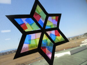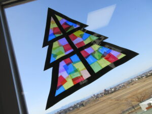 クリスマス会の装飾としてステンドグラス風のツリーと雪の結晶を作成しました。自然の光で明るく光り、職員からも「素敵」との声をいただきました😁