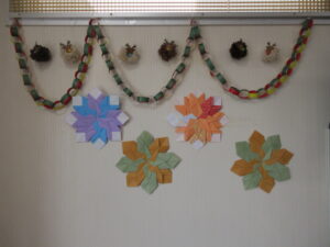 患者さん達で協力してたくさんの装飾品が完成し、ロビー全体がクリスマスモードに♪ こちらは折り紙の得意な方が雪の結晶を作ってくれました。8枚を重ね合わせて1つの結晶が出来ています。