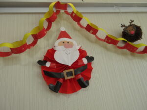 こちらは折り紙のサンタと、毛糸で作ったトナカイです。細かい工程もありましたが、みなさん諦めずに最後まで一生懸命作ってくれました。「サンタの手足がなかなか糊で付けられない」、「毛糸で丸みを出すのが大変・・・」と苦戦していましたが無事に完成しホッとされていました。