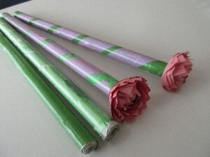 レクリエーションに必要なアイテムは患者さんと協力して作成しました。棒は新聞紙を丸め、テープで補強し春らしい色にしました。 高得点の棒にはお花をつけて春爛漫感を演出してみました。